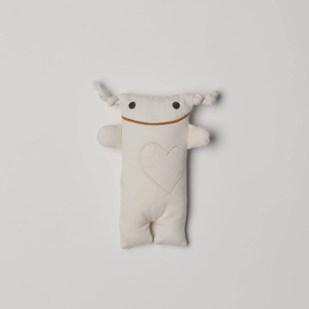 Peluche réconfortante et sécuritaire pour nouveau-né, en coton biologique tricoté localement.